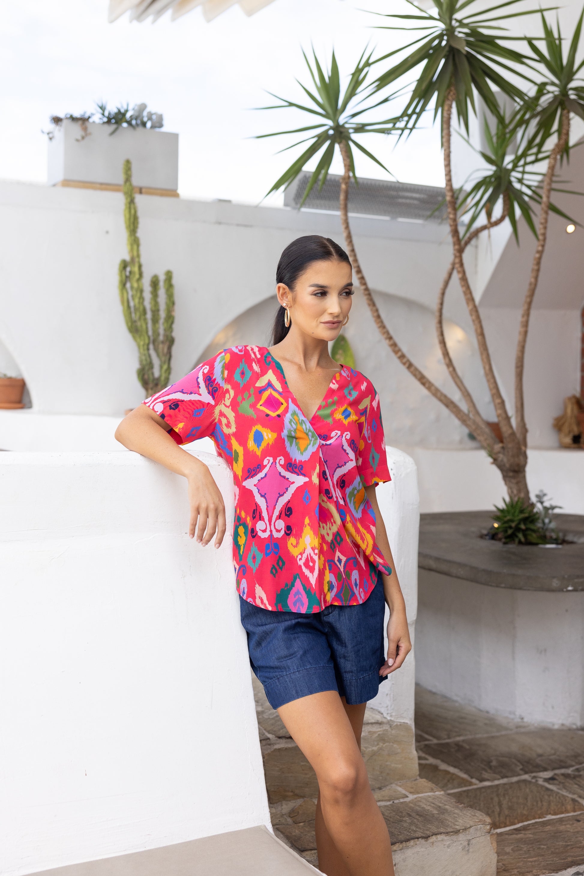 Make a statement this season with the Two T’s Ikat Print Top, crafted from 100% viscose for a soft, lightweight feel and beautiful drape. Showcasing a vibrant, eye-catching Ikat print, this relaxed-fit top brings colour and energy to your everyday wardrobe while keeping you comfortable.