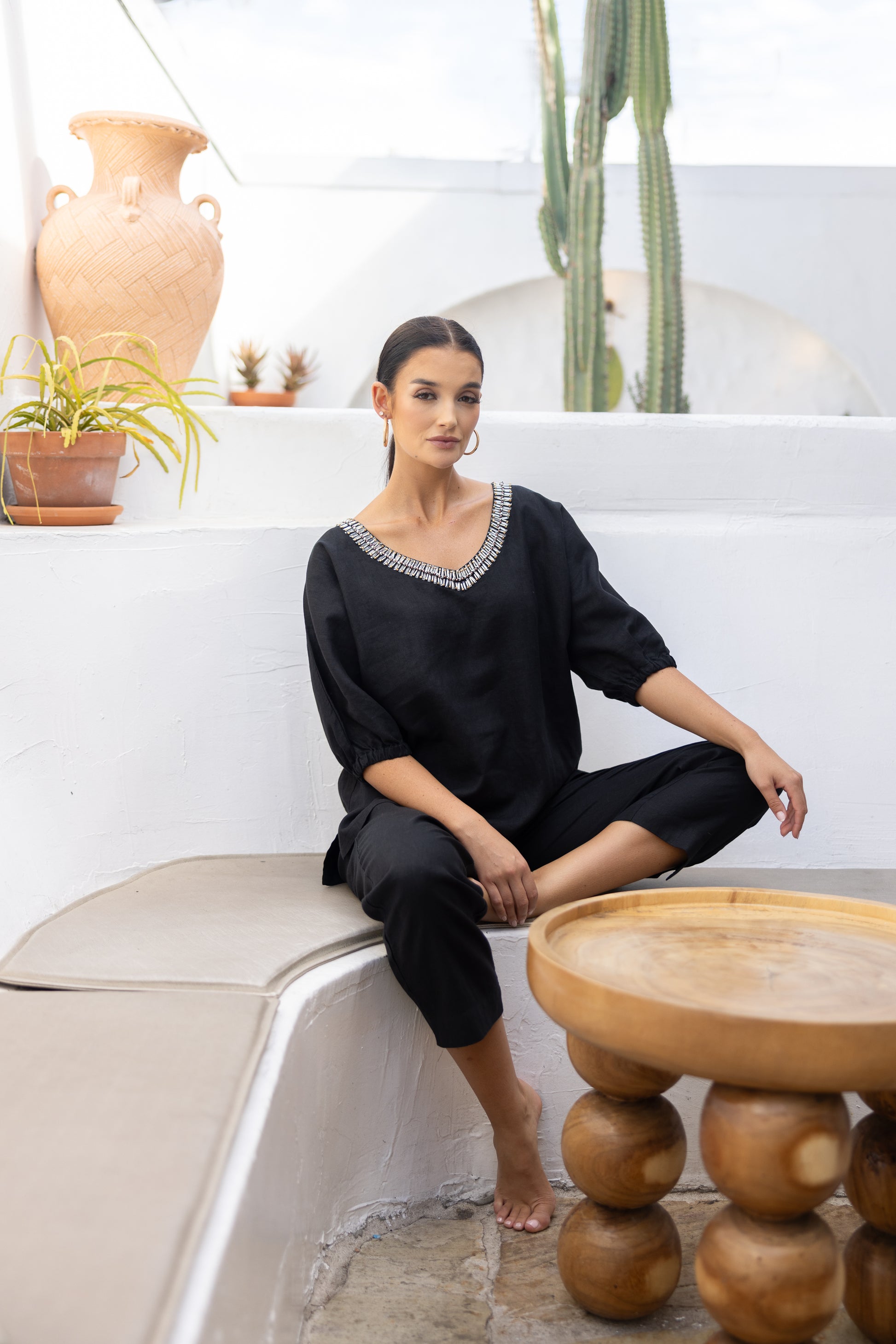 Two T's Linen V-Neck Beaded Top - Black