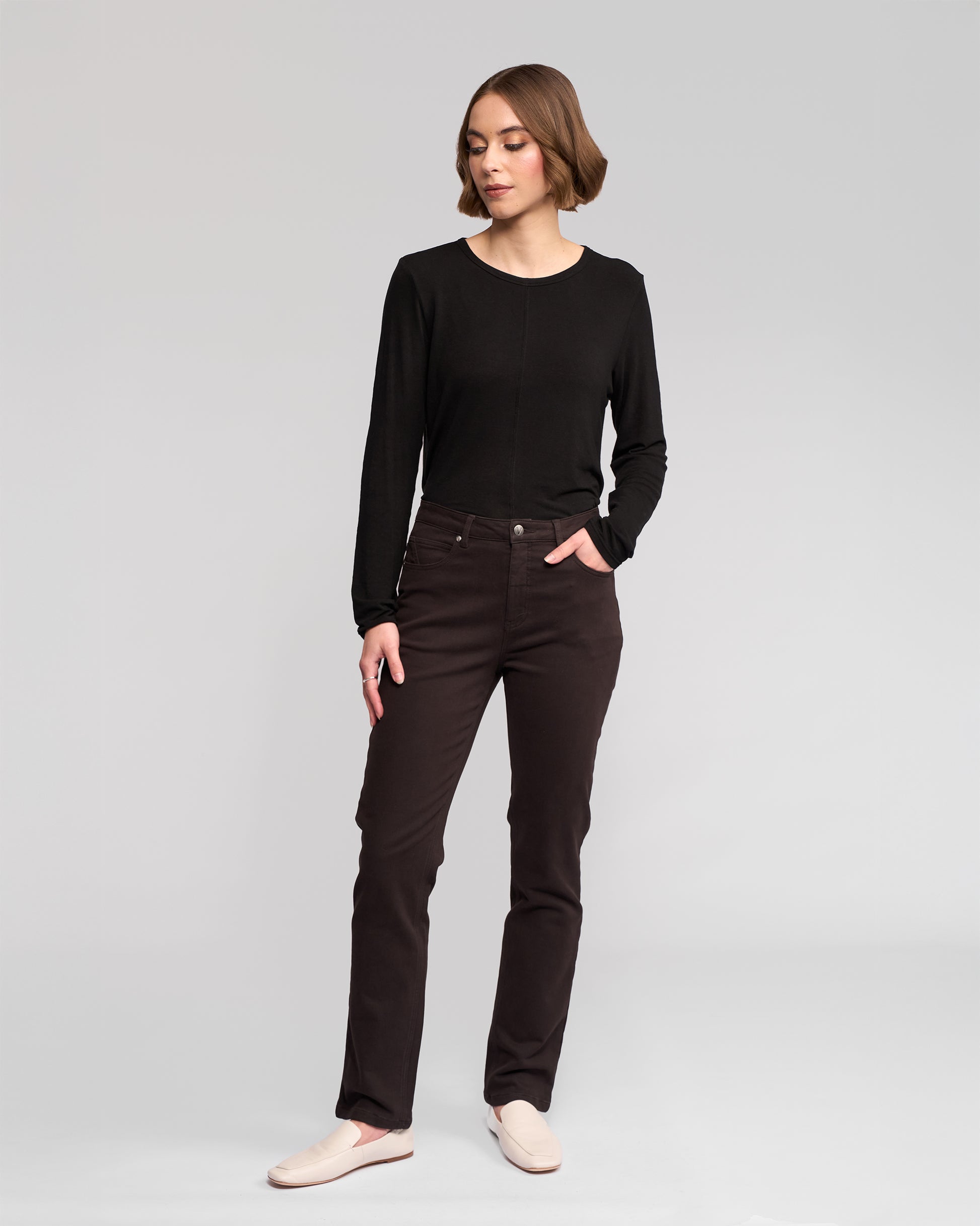 The Vassalli Slim Leg Jean in Chocolate is a stylish alternative to classic denim, featuring a rich dark brown shade perfect for the cooler seasons. Crafted from a soft cotton and tencel blend with added stretch, this winter-weight jean offers warmth, comfort, and a smooth feel while maintaining a polished denim look.